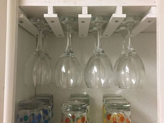 I was so excited when i saw these plans. This makes it very easy to pick out from a pile of other wood. To transform the space beneath your kitchen cabinet into a simple yet chic wine glass rack all you need is t molding a circular saw and drill and screws.