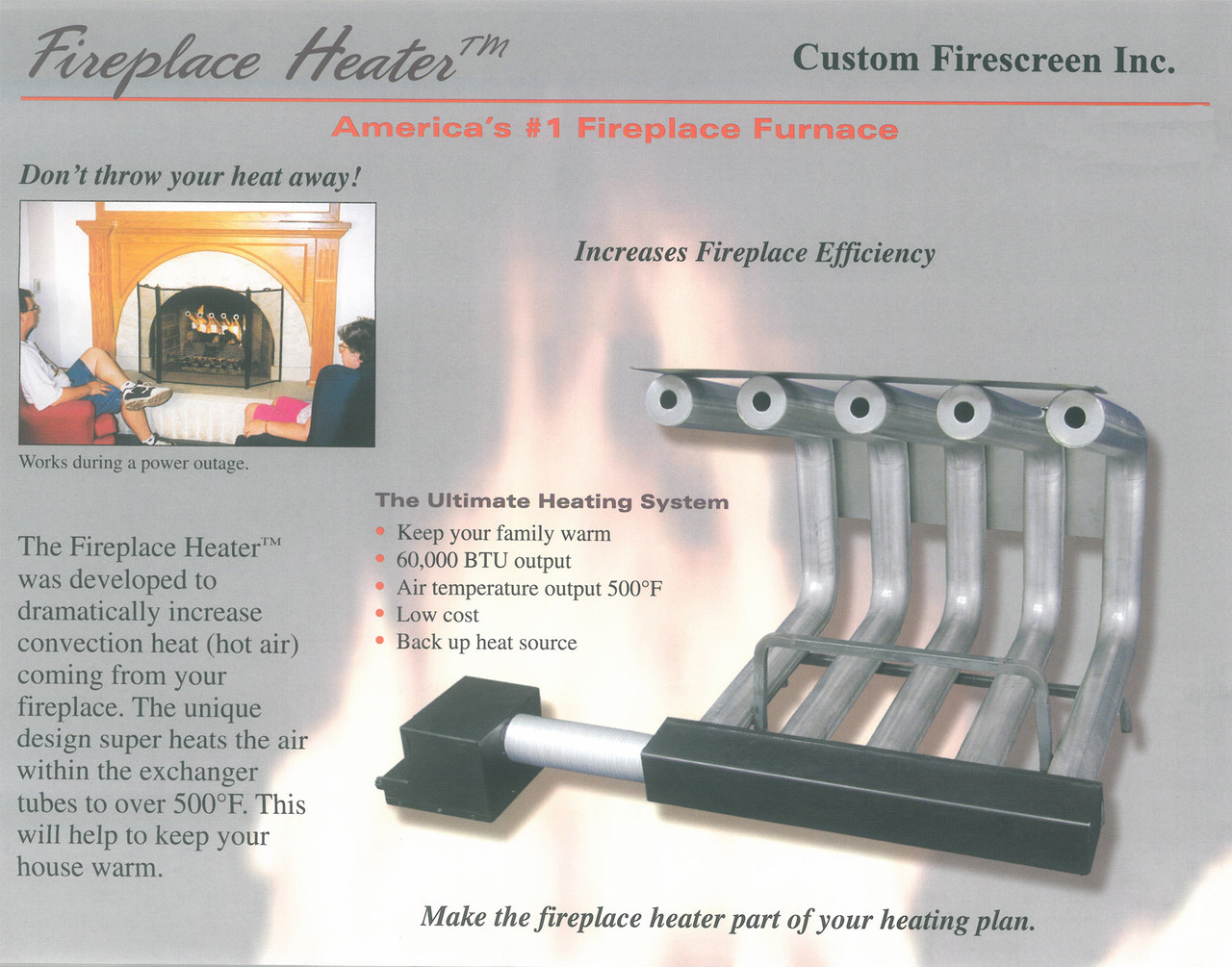 The inlet draws in cold air from the room. The spifire fireplace heater is a low profile heat exchanger that sits on the floor of your fireplace and was designed to boost the convection heat produced by your fireplace. The air inside these tubes is heated by fire built atop them and is then expelled through the outlet to heat the room.