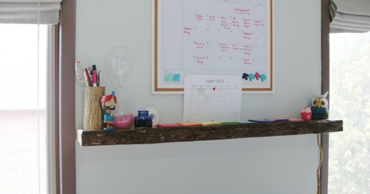 An innovative wall shelving system. Drill through the wall or tile into the blocking and studs. I used a piece of live edge maple however you could use any piece of wood you have on hand a 2×4 would be great.