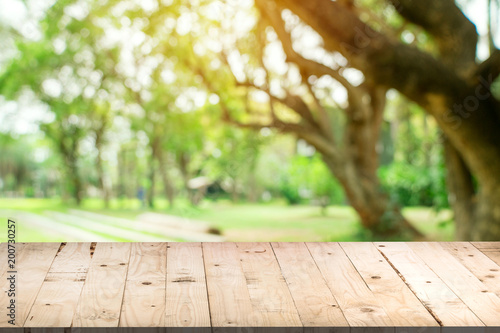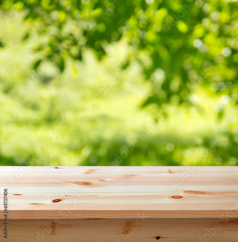 Empty Wood Table And Defocused Bokeh And Blur Background Of Garden